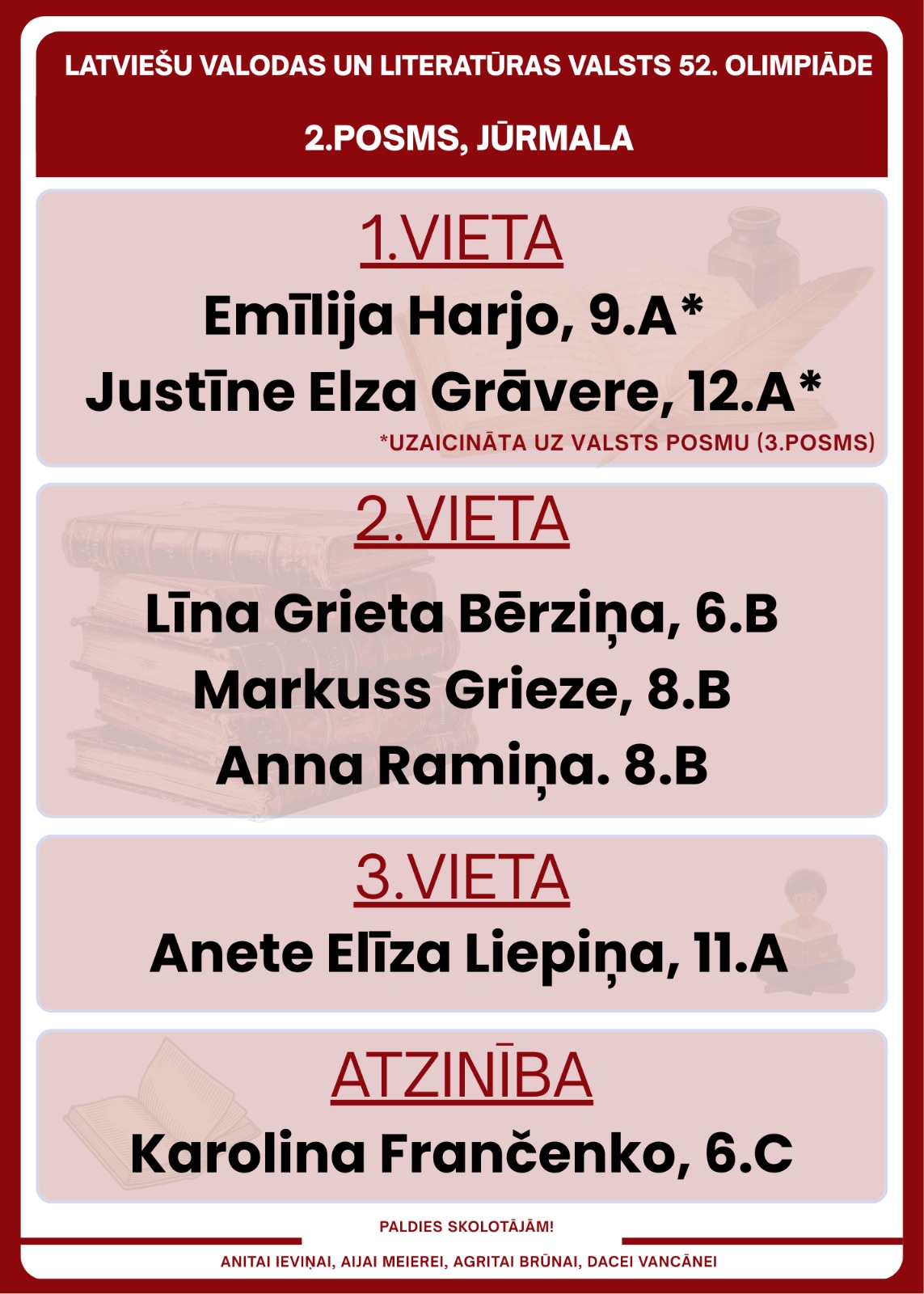 OlimpiādeLepojamies! admin1 dienas ago1 dienas ago01 mins Sasniegumu Latviešu valodas un literatūras olimpiādē! Ziņu izvēlne Previous: Vecāku nedēļa mūsu skolā — gaidām jūs!Next: Latvijas skolēnu 50. zinātniskās pētniecības darbu reģionālās konferences rezultāti!